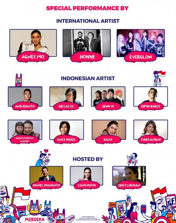 Konser virtual ini akan digelar di 3 Negara; Inggris, Korea Selatan, Indonesia, dalam satu rangkaian yang sama. Sederet artis Internasional seperti HONNE, musisi dari Inggris yang merajai berbagai tangga lagu dunia dalam setahun terakhir, EVERGLOW band pop dari Korea Selatan. Sedangkan, artis-artis top tanah air seperti AGNEZ MO siap memberi kejutan lewat lagu terbaru. Ada pula, Andi Rianto, Ari Lasso, Dewa 19, Dipha Barus, Gading Marten & Gempita, Once Mekel, Raisa dan Tiara Andini. Acara yang akan dipandu Daniel Mananta, Luna Maya dan Okky Lukman ini, akan berlangsung 4 jam mulai pukul 18:00 WIB secara langsung di Vidio.com juga di SCTV.