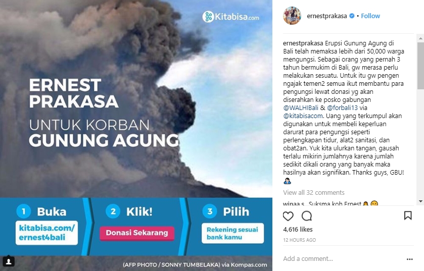 Mengutip kampanyenya di laman Kitabisa.com, Ernest menuturkan, sebagai seseorang yang pernah tinggal di Bali, Pulau Dewata selalu menjadi rumah kedua baginya. “Erupsi Gunung Agung di Bali telah memaksa lebih dari 50,000 warga mengungsi. Sebagai orang yang pernah 3 tahun bermukim di Bali, gw merasa perlu melakukan sesuatu. Untuk itu gw pengen ngajak temen-temen semua ikut membantu para pengungsi lewat donasi yg akan diserahkan ke posko gabungan @WALHIBali & @forbali13 via @kitabisacom.”