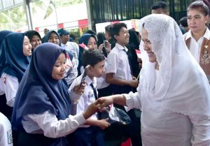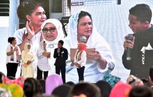 Banyuwangi, Trenz News | Ibu Negara Iriana Joko Widodo beserta Ibu Mufidah Jusuf Kalla dan Ibu-ibu anggota Organisasi Aksi Solidaritas Era Kabinet Kerja (OASE-KK) usai menghadiri seminar parenting, langsung melanjutkan agenda kunjungan kerjanya dengan menghadiri acara Sosialisasi Bahaya Narkoba, Pornografi, Hoaks, dan Bullying, serta Peduli Kebersihan dan Lingkungan Hidup. Acara ini dihelat di gedung Tennis Indoor Banyuwangi, Senin 28 Januari 2019, dan dihadiri ratusan pelajar SD dan SMP se-Kabupaten Banyuwangi.