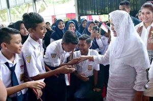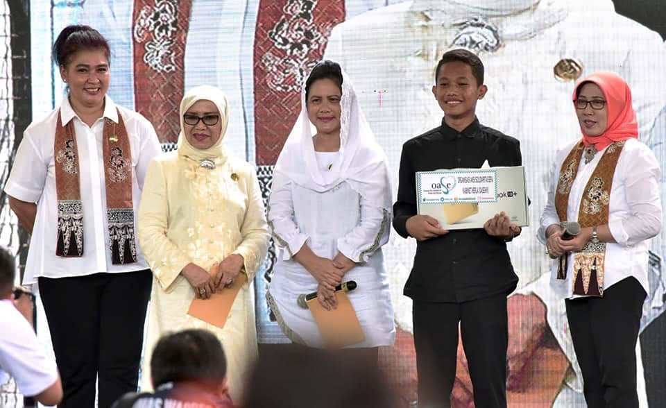 “Hadiahnya laptop,” seru Ibu Iriana sambil memberikan hadiah. Ini membuat seluruh pelajar yang hadir riuh bertepuk tangan.