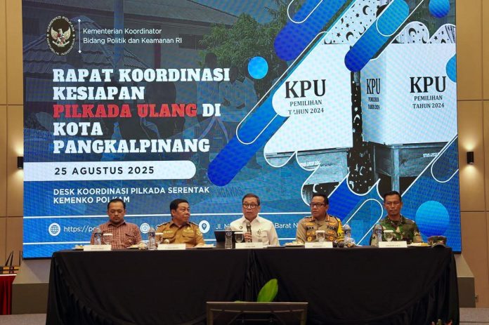 Pangkalpinang, Trenzindonesia.com | Kementerian Koordinator Bidang Politik, Hukum, dan Keamanan (Kemenko Polhukam) mengambil langkah proaktif untuk mengawal proses Pilkada Ulang di Kota Pangkalpinang, Provinsi Bangka Belitung. Melalui Desk Koordinasi Pilkada Serentak, pemerintah memastikan seluruh tahapan demokrasi berjalan aman, lancar, terkendali, dan berintegritas.