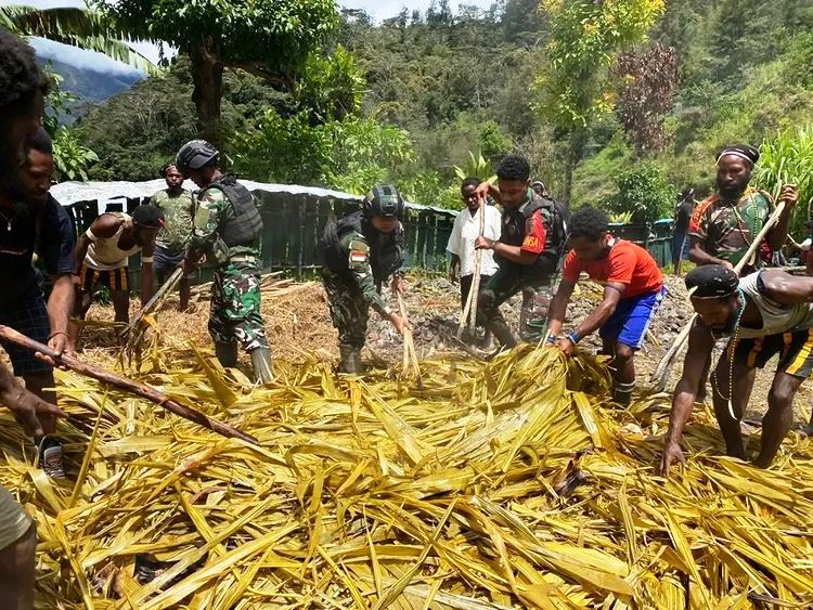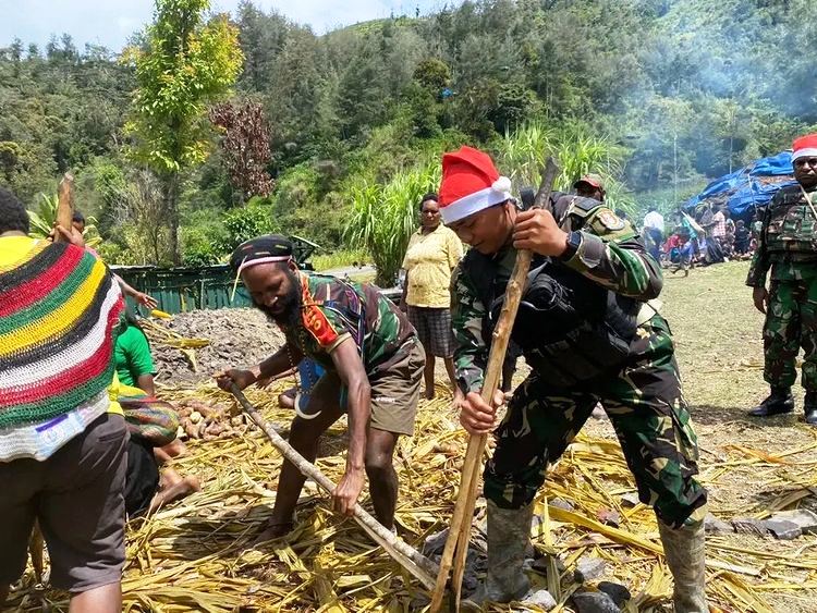 PUNCAK PAPUA, Trenz News | Dalam rangka Perayaan Hari Natal 2022, Satgas Satuan Organik Yonif Raider 303/SSM Kostrad Pos Beoga mengadakan doa bersama dan kegiatan Tradisi Bakar Batu bersama masyarakat Kampung Milawak, Distrik Beoga Kabupaten Puncak Papua, Selasa (27/12/2022).
