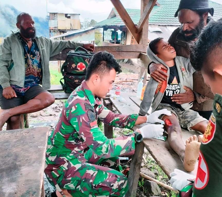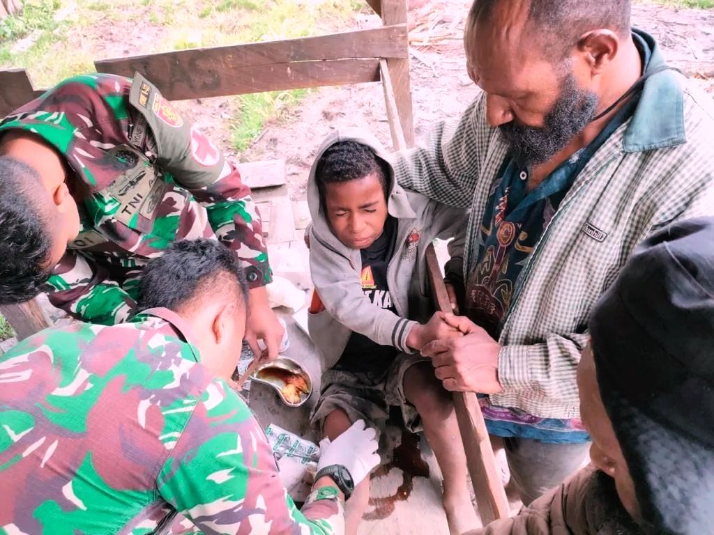 NDUGA PAPUA, Trenzindonesia | Tim Medis dari Pos Dal Satgas Yonif Raider 321/GT/13/1 Kostrad memberikan pertolongan pertama kepada seorang anak yang terkena benda tajam ketika sedang berkebun, bertempat di Distrik Dal, Kabupaten Nduga, Papua.