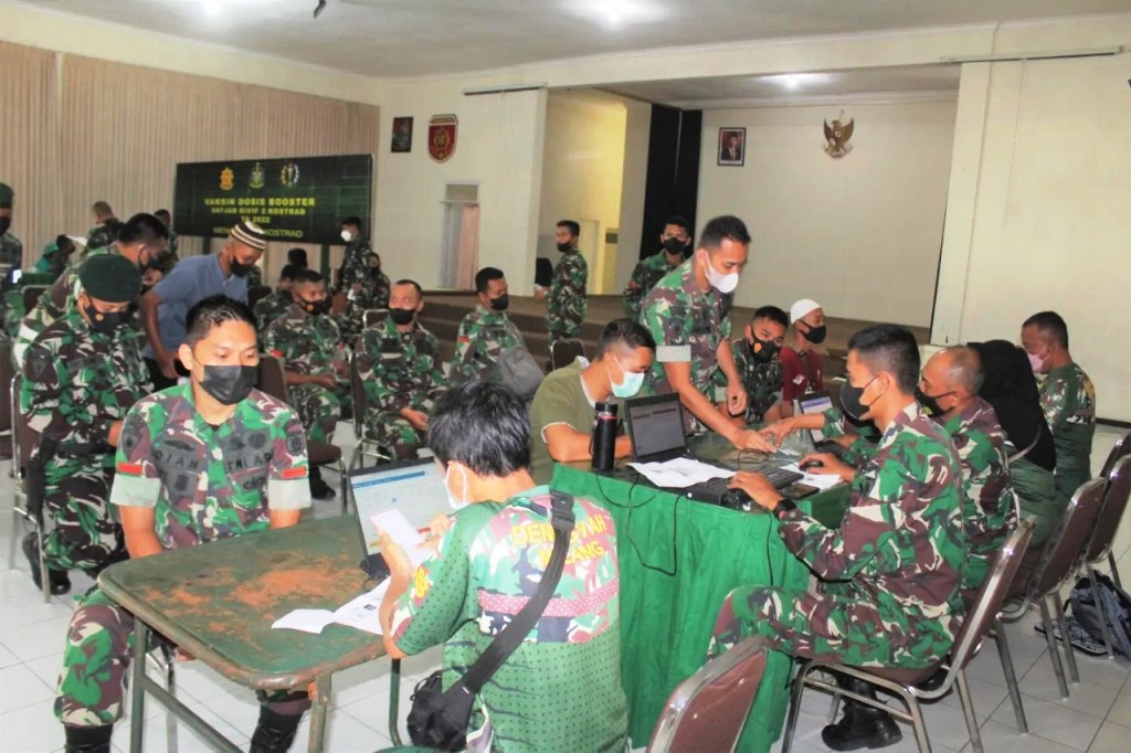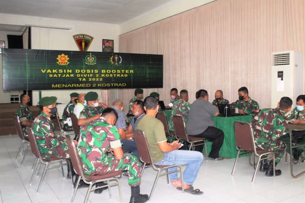 MALANG, Trenz Newws | Dalam rangka menyukseskan program pemerintah untuk mengatasi penyebaran virus Covid-19, ratusan prajurit digerakkan oleh Danmenarmed 2 Kostrad untuk melaksanakan vaksinasi Covid-19 lanjutan (Vaksin Dosis Booster) yang dilaksanakan di Aula Molilamasi Menarmed 2 Kostrad, Malang. Senin. (31/01/2022).
