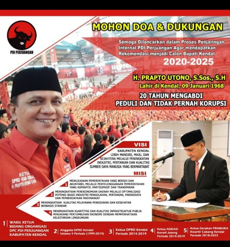 Kendal, Trenz Profile | Usai mengabdi sebagai Ketua DPRD Kendal, Jawa Tengah, Periode 2014-2019 dari Fraksi PDI Perjuangan, H. Prapto Utono, S.Sos., S.H kini bersiap untuk bisa menjadi Calon Bupati Kendal 2020 -2025.