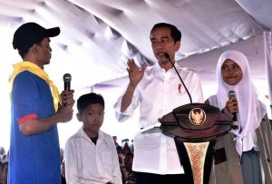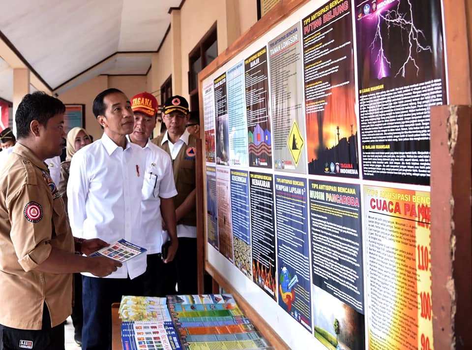 Tiba di lokasi pukul 09.00 WIB, Presiden Jokowi langsung meninjau para pengajar memberikan pendidikan kebencanaan kepada siswa siswi. Untuk memudahkan para murid, tahapan keselamatan bencana dikemas dalam bentuk sebuah lagu.