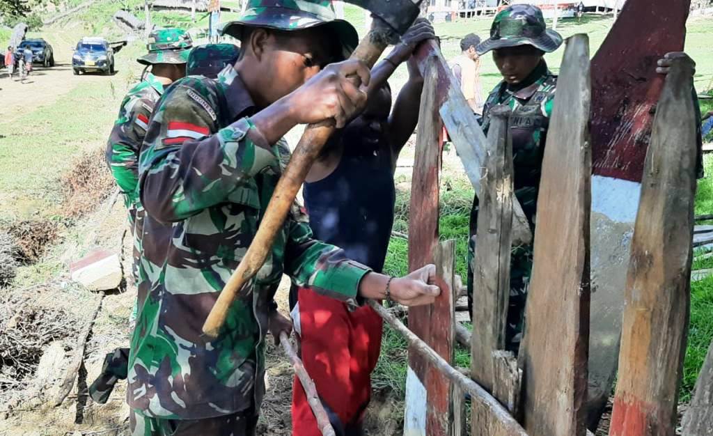 Pada kesempatan kali ini, anggota Satgas Pos Balingga gotong royong kerja bakti bersama warga Kampung Yumaneri dalam membuat pagar kayu untuk kantor pemerintah Distrik Balingga Kabupaten Lanny Jaya supaya terlihat rapi dan bersih, suasana kekeluargaan mewarnai proses pengerjaan pagar.