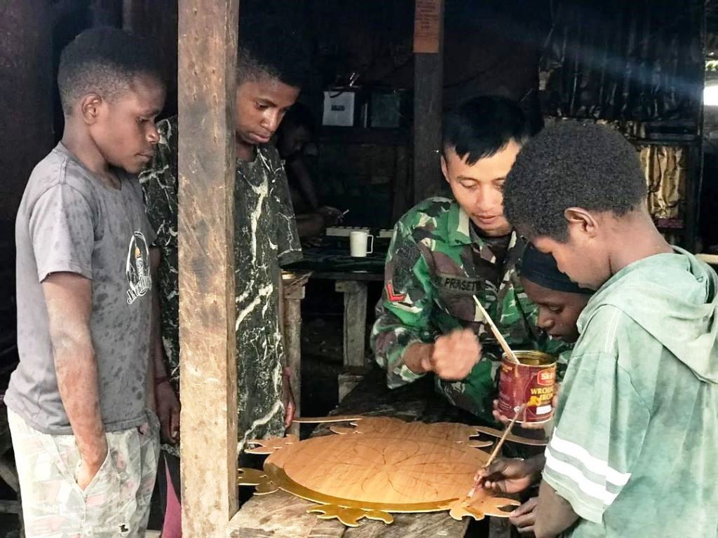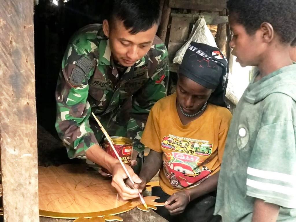 NDUGA PAPUA, Trenzindonesia | Dalam rangka merayakan Tahun Baru dan memberikan semangat baru ke pada masyarakat personel Pos Yigi Satgas Yonif Raider 321/GT/13/1 Kostrad berinisiatif mengajarkan anak Distrik Yigi membuat kerajinan tangan. Kerajinan tangan yang diajarkan ialah cara membuat hiasan dinding.